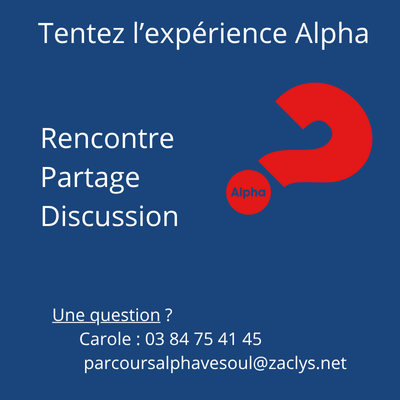 Le Parcours Alpha, ce sont 10 rencontres pour parler de la foi chrétienne, du sens de la vie, de toutes ces questions que nous nous posons et qui restent souvent sans réponse. Chaque rencontre comprend un repas, un topo sur le thème du jour puis une discussion où chacun peut s’exprimer en toute liberté. (Carole C.)