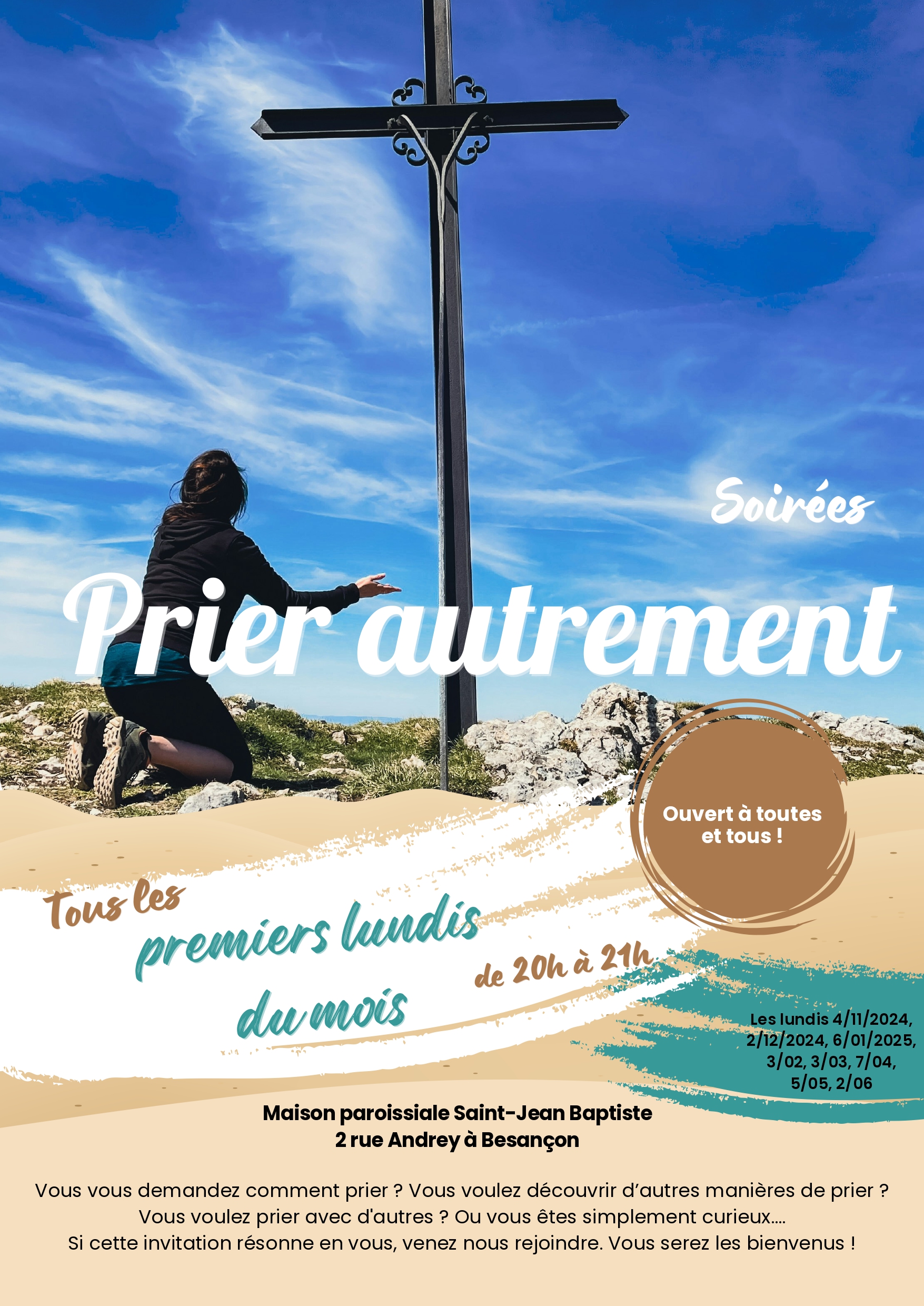 Tous les premiers lundis de chaque mois, soirées de découverte de différentes manières de prier avec d'autres. Ces temps de prière sont guidés. Il n'y a pas besoin de savoir prier.