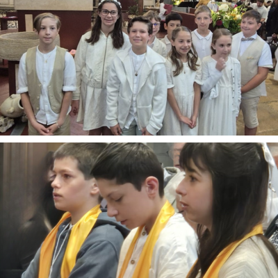 L'église de Port-sur-Saône était remplie de tous les accompagnants, parents, parrains et marraines autour de Jules, Juliana, Chloé, Clémence, Lucas et Enzo venus pour communier pour la première fois au Corps du Christ, après avoir suivi plusieurs années de catéchèse dont la dernière avec le père Emmanuel. Cinq autres jeunes en classe de 5è et 4è sont venus proclamer leur foi après avoir suivi une retraite de plusieurs jours chez les Sœurs des Fontenelles ; retraite qui les a vraiment marquée et conforter dans leur foi. Au retour, ils ne s'arrêtaient plus de chanter et louer le Seigneur ! Nous souhaitons à Noah, Clara, Clotilde, Léopold et Candice de pouvoir continuer sur ce chemin pour les conduire jusqu'à la confirmation et tout au long de leur vie avec Jésus dans leur cœur. Ils ont proclamé, devant l'assemblée leur foi dans leur "Je crois". Je crois en Dieu créateur, protecteur et libérateur et en son amour infini. Je crois en Jésus-Christ et en son amour envers tous, qui s'est sacrifié pour l'humanité. Je crois en l'Esprit-Saine qui nous souffle ses conseils, nous guide et illumine nos cœurs. Je crois aux paroles de Jésus, en ses miracles, aux prières qui s'exaucent et au pardon des péchés. Je crois que Marie est Vierge et Sainte. (Martine et les catéchistes)