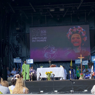 Dans le cadre de la 34ème édition du Festival Spectacles du Monde, la messe, présidée par l'abbé Guillaume, était célébrée, en plein air, ce dimanche 11 août 2024. Quelle belle communauté, très colorée, priante, chantante, grâce à la participation des groupes venant du Brésil, de Colombie, du Congo, des États-Unis, de Moldavie, d'Ouzbékistan ; mais aussi de France avec les Batuc'ados, Bleuniadur, Dansomp ar Vro, Marins d'Iroise