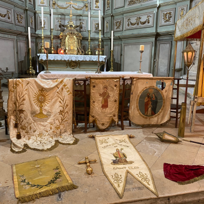 « Dans la nef, les chasubles anciennes étaient présentées face aux plus récentes. Au total, 18 vêtements religieux étaient présentés : Chasubles, chape, voile huméral et la tenue ancienne du servant d’autel. Le Dais de l’église, tout juste restauré, a été monté et exposé aux yeux du public. Également, différents objets du culte catholique ont été présentés (encensoir, clochettes, missel, etc). Cela a été pour les visiteurs l’occasion de découvrir l’église et le culte catholique. » (© Marius E.) Un grand merci au jeune Marius pour le souci et le soin portés à l'organisation de cette belle exposition.