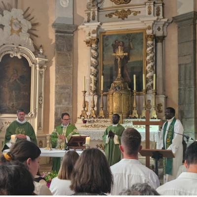Eucharistie présidée par le Père Franck Ruffiot et concélébrée par le Vicaire Général Christophe Bazin et les deux prêtres Camerounais Justin et Jacques venus prêter main forte pendant les vacances d'été sur nos paroisses. Un dimanche de joie avec le Baptême d'Alba et Augustin, un jour d'accueil de nos deux catéchumènes Virginie et Pierre. Un jour d'au revoir et de convivialité autour du Père Justin et du Père Jacques qui nous quittent pour rejoindre le continent africain. À L'ANNÉE PROCHAINE ! (Christine Chorvat)