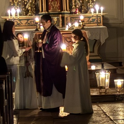 Lundi 23 décembre 2024, en l'église de Vellefaux. Avec pour seules lumières celles des bougies, cette liturgie fait de chaque fidèle un guetteur d’aurore qui attend dans l’espérance l’événement de Noël, l’avènement du Christ.