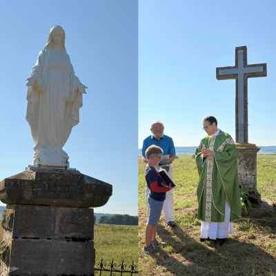 Beau moment de communion ce dimanche 24 août en l'église de Vellefrie ; après la messe présidée par l'abbé Franck Ruffiot, les fidèles se sont rendus, en procession, auprès du calvaire et de la statue de la Vierge Marie. Fraîchement restaurés par la Municipalité et notre ami Noël, la croix et la statue de Marie ont été bénites par l'abbé.