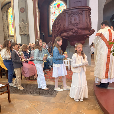Dimanche 25 mai 2025, en l'église Saint-Georges de Vesoul, l'abbé Franck Ruffiot a présidé l'Eucharistie au cours de laquelle : Gabriel BAUGEY-BREITNER, Stan BLANDIN, Juliette et Tom BROUILLET, Maëlie LANOUE, Sandro et Stella SEBILLE, Louis VITEAUX et Louise DRESSE ont reçu le sacrement de l’Eucharistie pour la première fois. Férréol ABRANT-GRANDGIRARD, Inès CANDANEDO, Louis GARNIRON, Apolline MAGNIN, Elsa PLEIGNET, Léa-Rose ROUX et Séréna SAGE ont professé leur foi. C’est accompagnés par leurs catéchistes et entourés de leurs parents, leur famille et de la communauté, qu’ils ont vécu ces moments importants dans leur vie de jeunes chrétiens. D'autres célébrations de 1ère des communions et profession de foi auront lieu les 8 et 15 juin prochains.