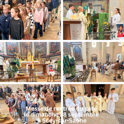 Les enfants de la catéchèse, accompagnés de leurs catéchistes et de leurs parents, faisaient leur rentrée le dimanche 28 septembre au cours de la messe dominicale en l'église de Scey-sur-Saône. C'était aussi la rentrée pour les servants d'autel. Deux familles ont également présentés leurs bébés à la communauté afin qu'ils reçoivent le baptême qui fut célébré au cours de la célébration. Ce fut, pour les enfants, l'occasion de découvrir saint Carlo Acutis, canonisé par le Pape Léon XIV le 7 septembre dernier. Dans son homélie, l'abbé Jean-Bosco a invité les enfants, les jeunes et les moins jeunes, à suivre les pas de saint Carlo ; Avant la bénédiction solennelle et le chant d'envoi, l'abbé a béni les cartables des enfants.