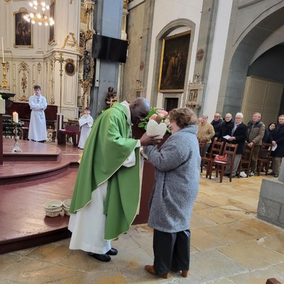 Au cours de la célébration dominicale du dimanche 18 mai, l'abbé Jean-Marie a remis la statue du saint-Ange à Madame Lucie THERY habitant le village de Marloz. (©David D.)