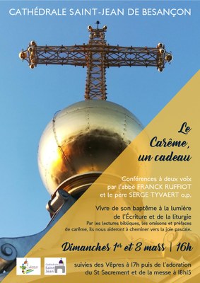 Les dimanches 1er et 8 mars à 16 h en la cathédrale se tiendront les conférences de carême à deux voix par l’abbé Franck RUFFIOT et le Père Serge TYVAERT: "Le Carême, un cadeau ". Vivre de son baptême à la lumière de l’Écriture et de la liturgie. Par les lectures bibliques, les oraisons et préfaces de carême, ils nous aideront à cheminer vers la joie pascale. Cette conférence sera suivie des vêpres (à 17h), de l’adoration eucharistique puis de la messe dominicale à 18h15. La prochaine conférence de Carême aura lieu le dimanche 8 mars.
