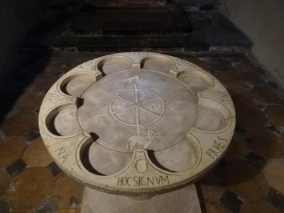 Original du IVe siècle ou copie du XIe siècle, on hésite à le dire, il est conforme de toutes manières à la famille des autels anciens creusés en cuvette et souvent orné, comme ici, de lobes arrondis. Mais cette formule, il la porte à une perfection que ne l'on se lasse pas de contempler.