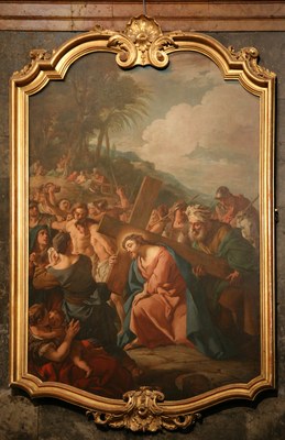 Précédé de deux malfaiteurs déjà dévêtus pour être crucifiés, suivi de Simon de Cyrène réquisitionné pour l’aider à porter sa croix, Jésus, le visage empreint de tristesse, porte le poids de toutes les violences. Pourtant, le peintre le représente corps et habits intacts, malgré flagellation et outrages, rappelant ainsi sa filiation divine et « sa royauté qui n’est pas de ce monde » (Jean, 18, 36). La précieuse tunique rouge confesse qu’en Jésus « Dieu s’est fait homme » (Jean, 1, 14) ; et le vaste manteau ruisselant de bleu rappelle que, par Lui et en Lui, le Ciel s’est offert à la terre.