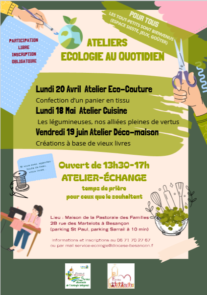 La maison de la pastorale des familles qui vient tout juste d'ouvrir, 2B rue des Martelots chez les soeurs de la Charité, vous propose 3 ateliers en lien avec les service écologique intégrale.