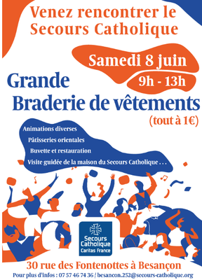 Le Secours Catholique anime une Grande Braderie de vêtements (tout à 1€) 30 rue des Fontenottes à Besançon Le samedi 8 juin de 9h à 13h