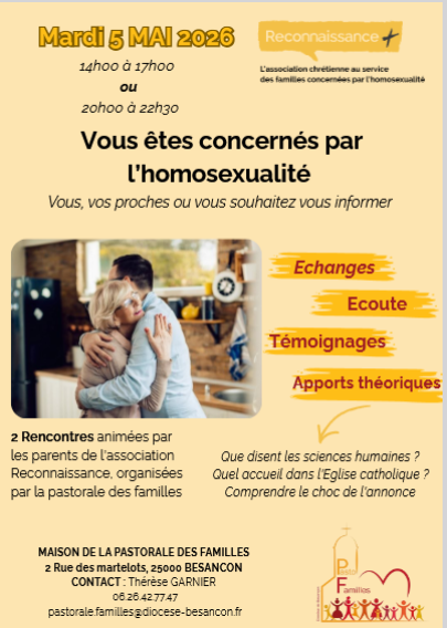 La pastorale des familles propose un temps de rencontre avec des parents de l’association Reconnaissance qui nous aideront, par leur témoignage et l’apport d’enseignement à mieux appréhender la réalité de l’homosexualité.