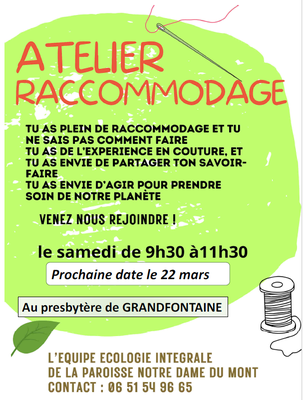 Le principe est de se retrouver pour échanger nos savoir-faire, apprendre à réparer des vêtements, créer divers décorations avec des chutes de tissu et ainsi mettre en application l’engagement de limiter notre consommation. Même si vous ne savez pas coudre, venez passer un moment à l’atelier avec vos raccommodages !