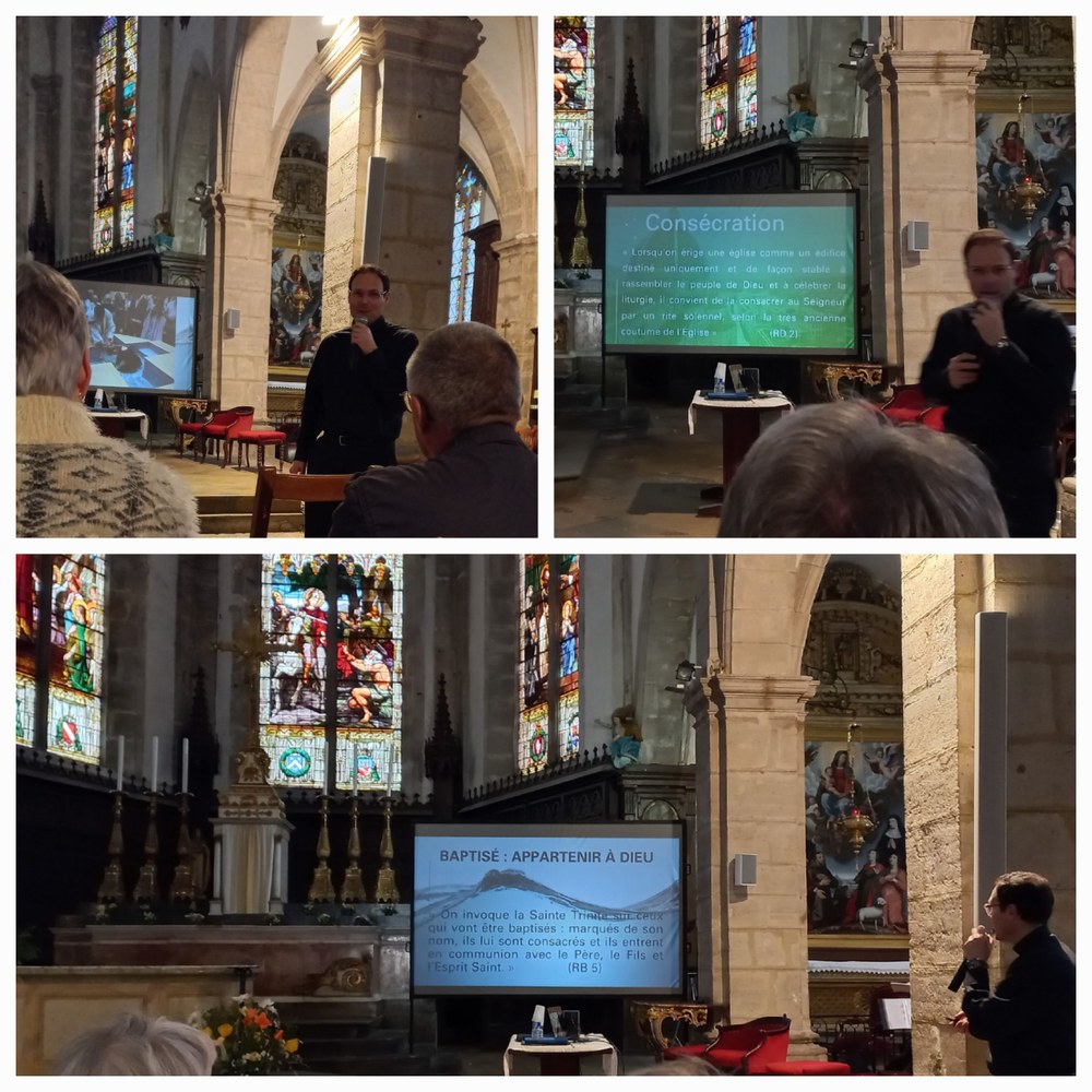 Quel plaisir d’écouter le père Ruffiot, passionné, simple et clair dans ses explications. Comme l’indique le titre de la conférence, nous avons fait le parallèle entre les rites, paroles et gestes présents lors de la consécration (et dédicace) d’une église et ceux présents lors d’un baptême.