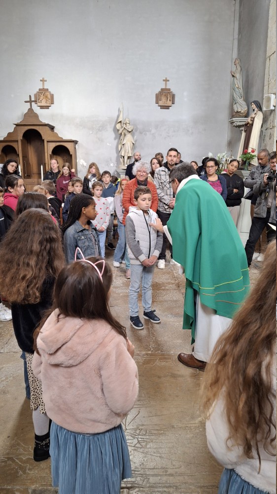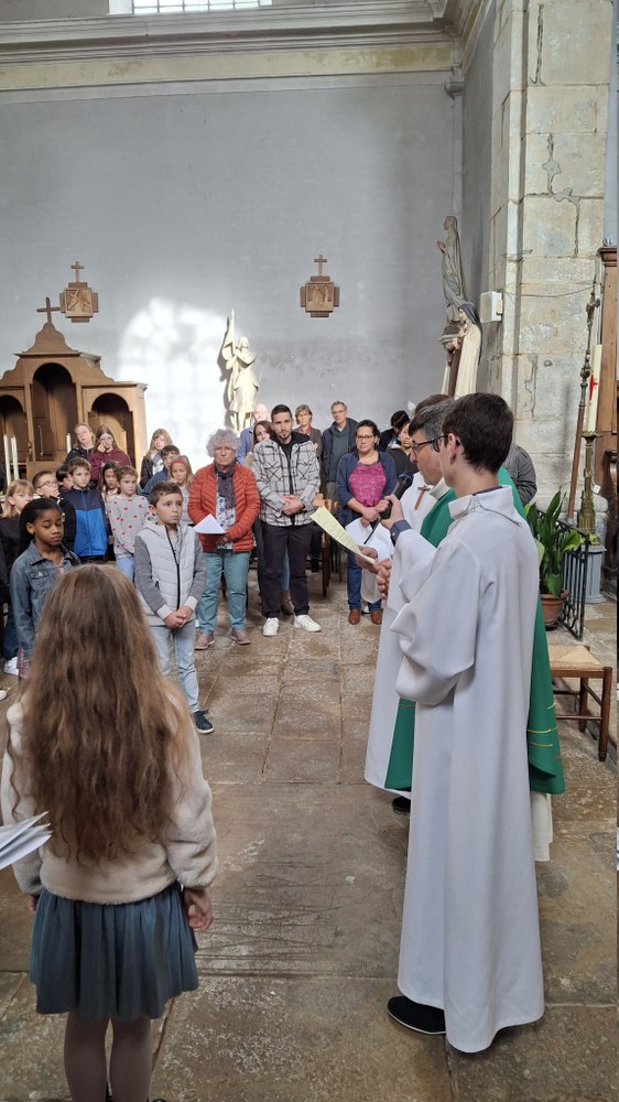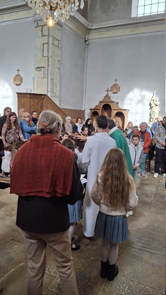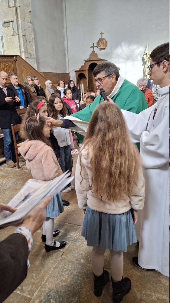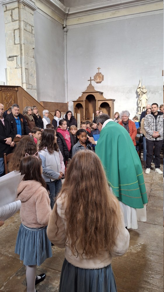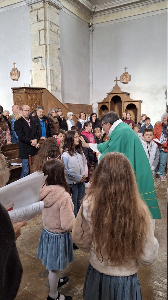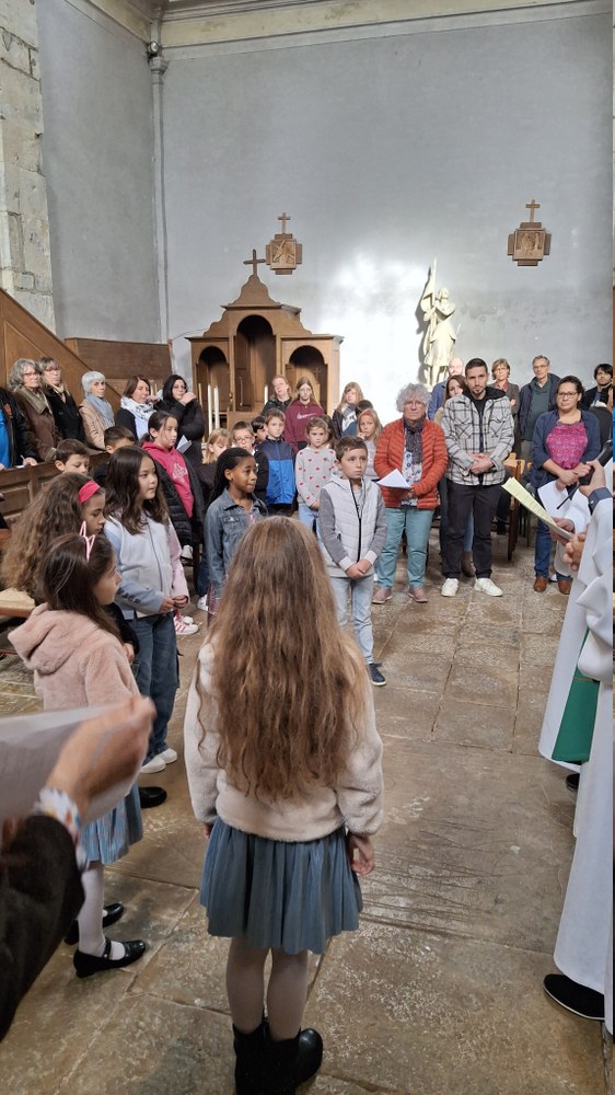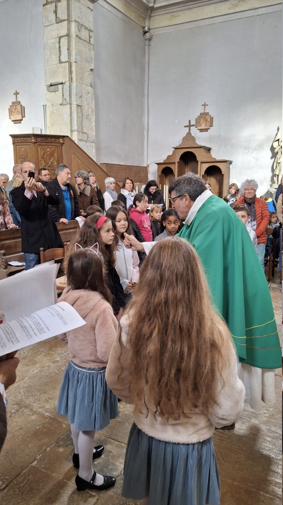 Dimanche 13 octobre 2024, à Marchaux durant la messe des familles : l’entrée en Église pour 6 enfants en âge scolaire.
