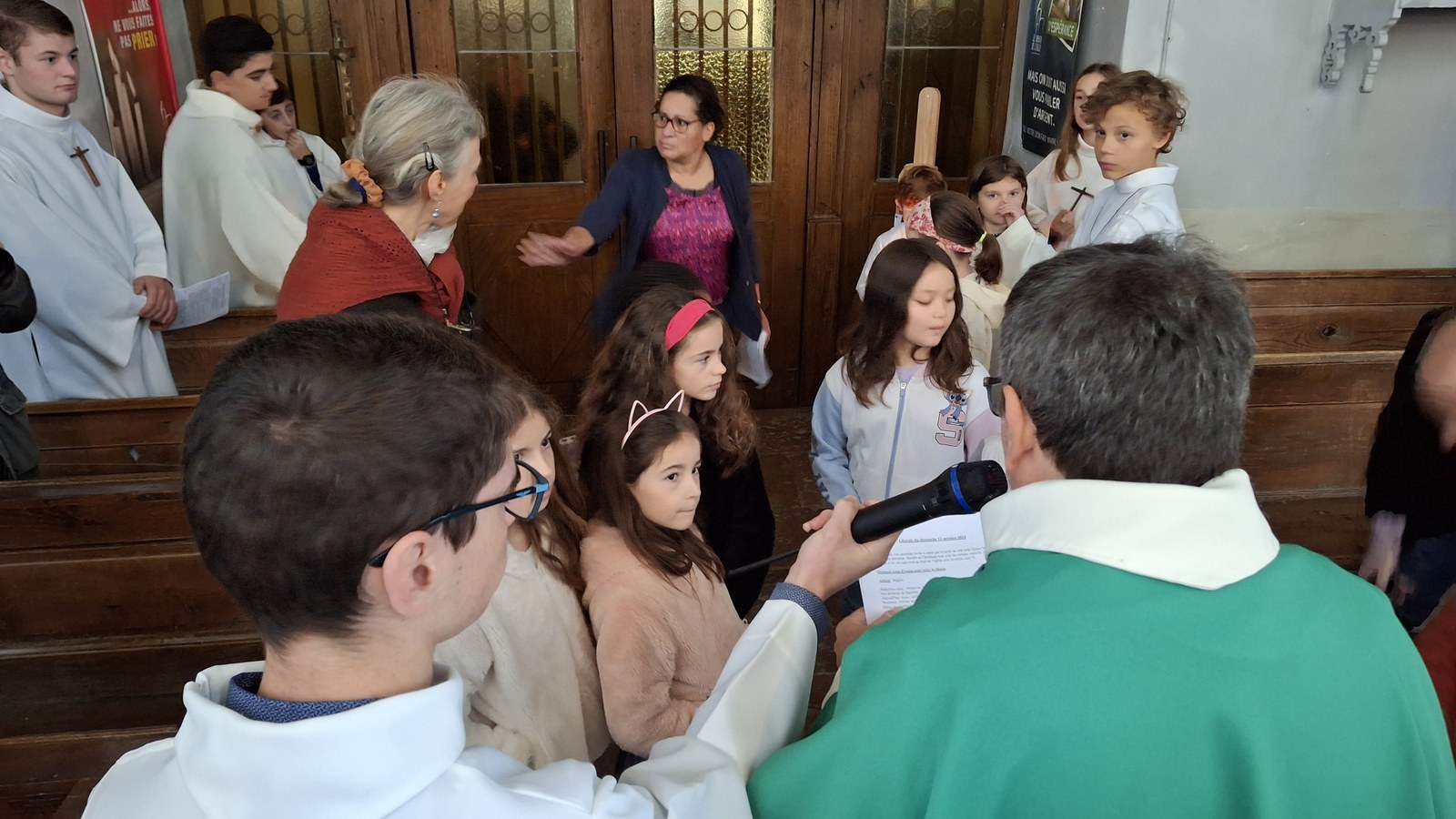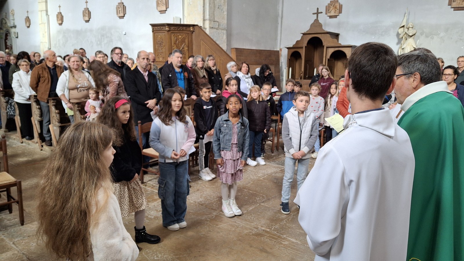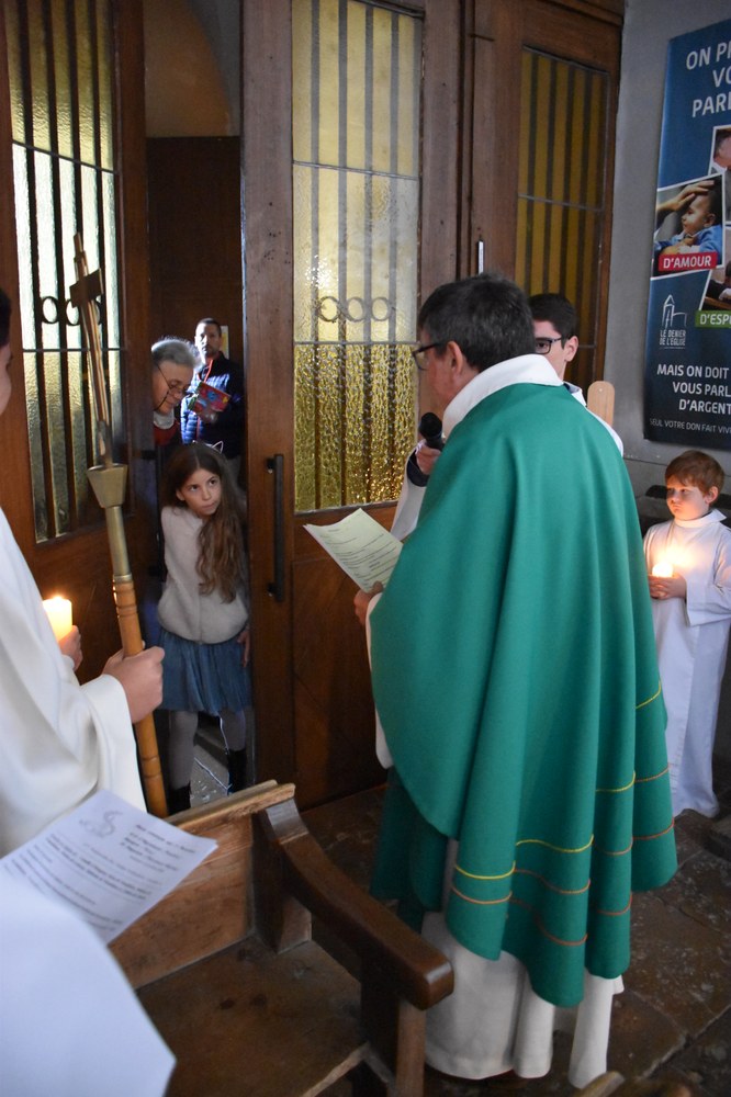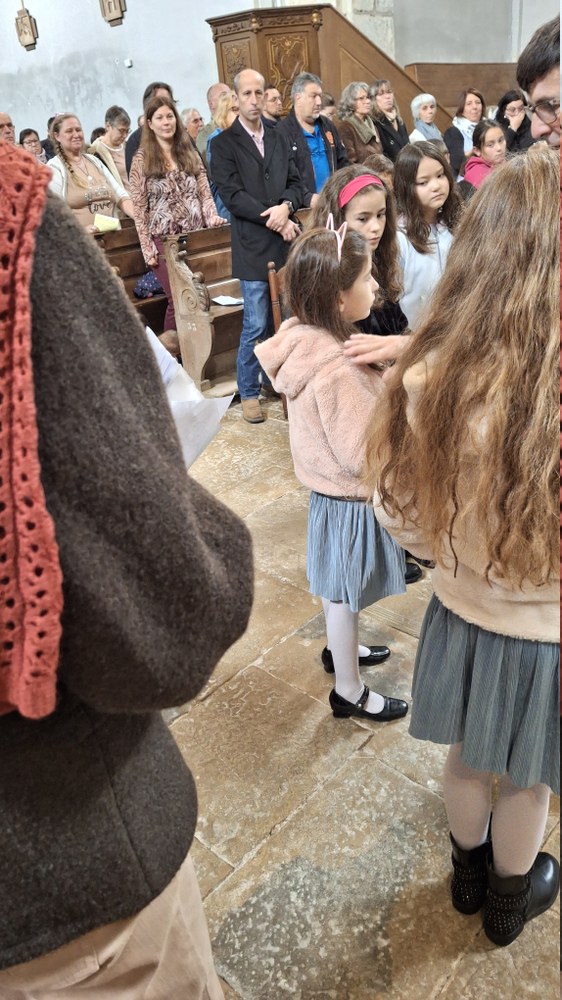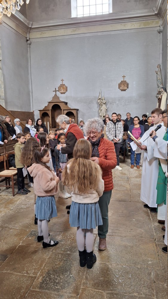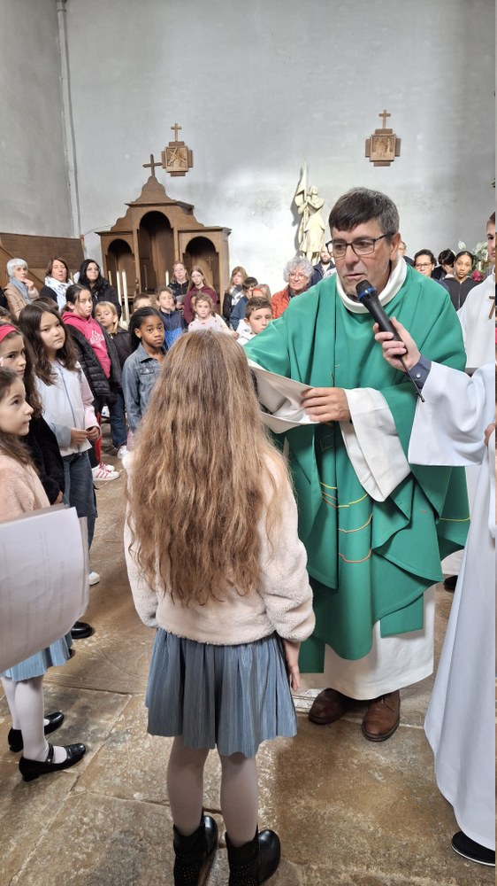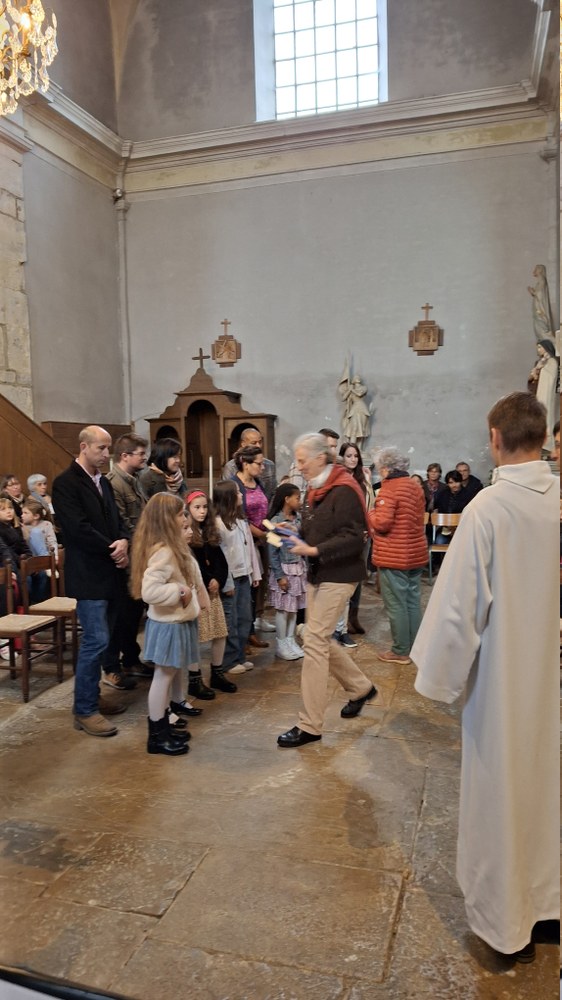 Dimanche 13 octobre 2024, à Marchaux durant la messe des familles : l’entrée en Église pour 6 enfants en âge scolaire.