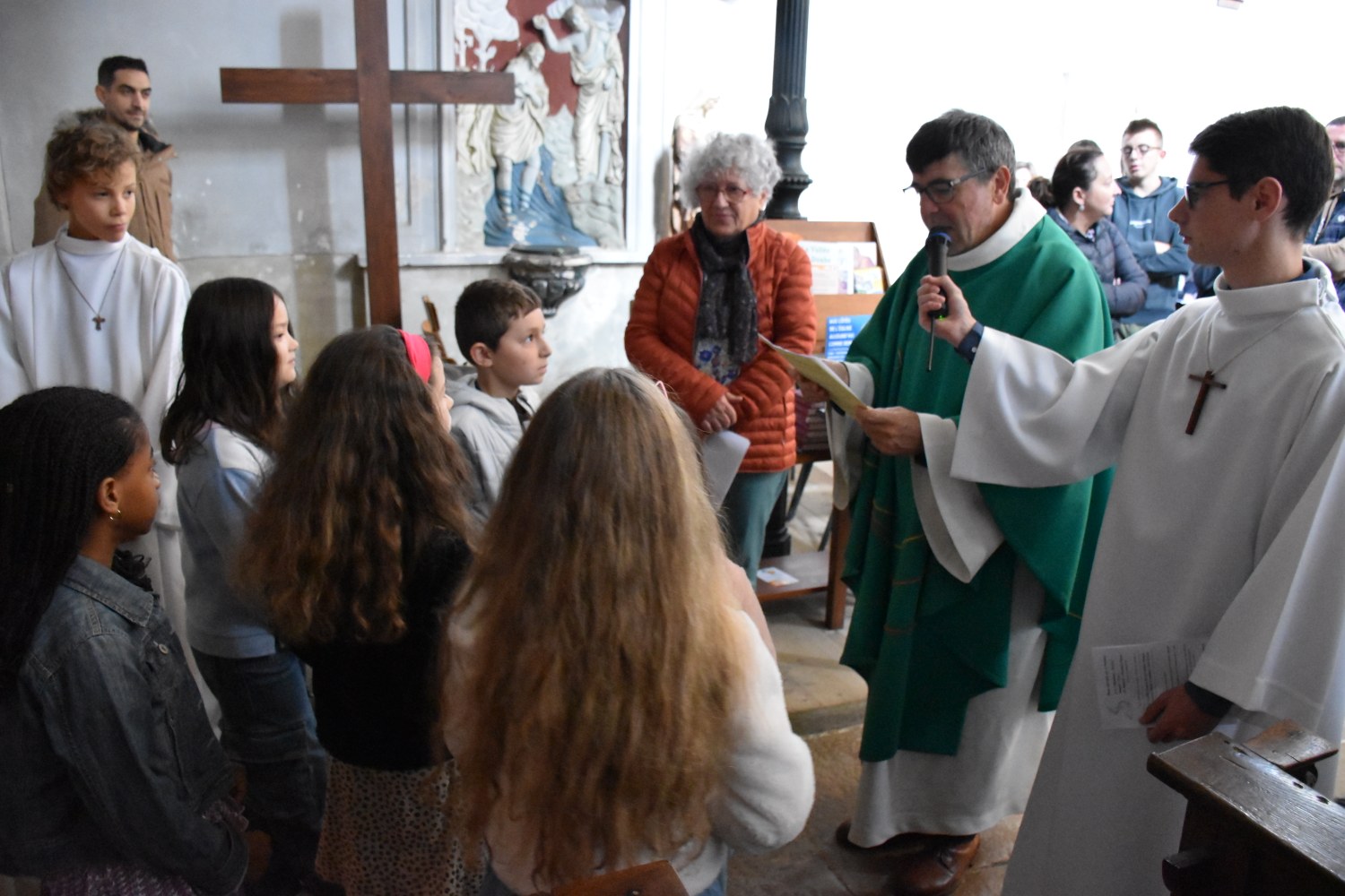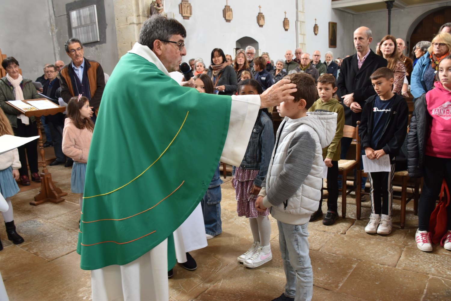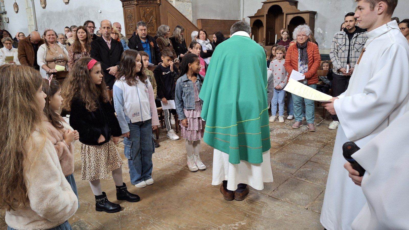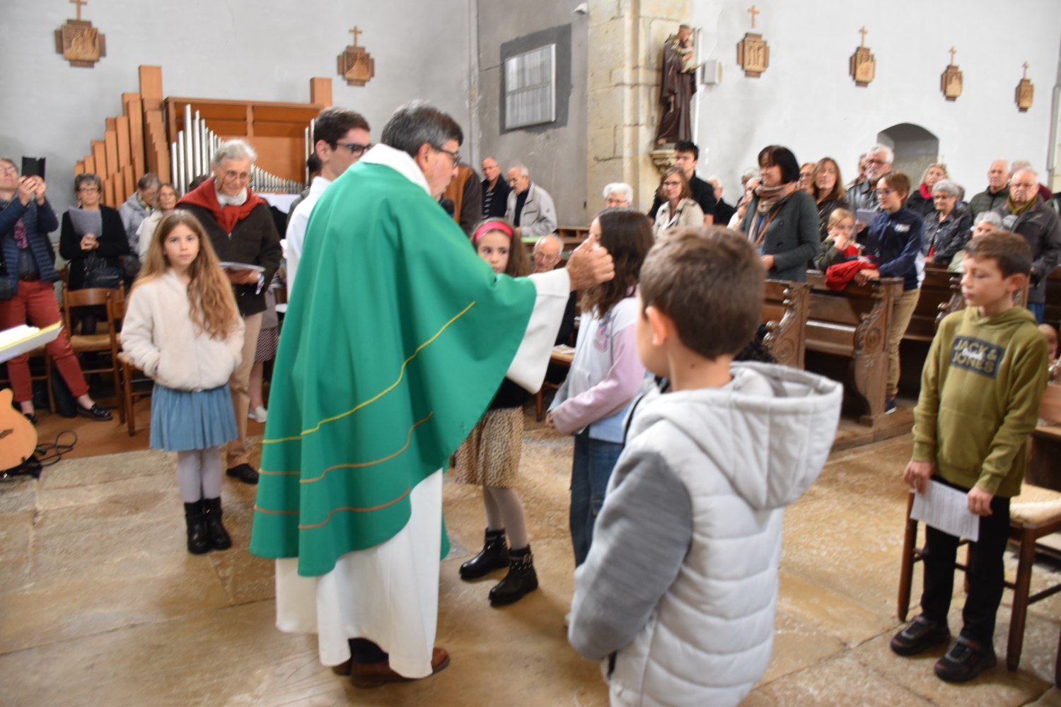 Dimanche 13 octobre 2024, à Marchaux durant la messe des familles : l’entrée en Église pour 6 enfants en âge scolaire.