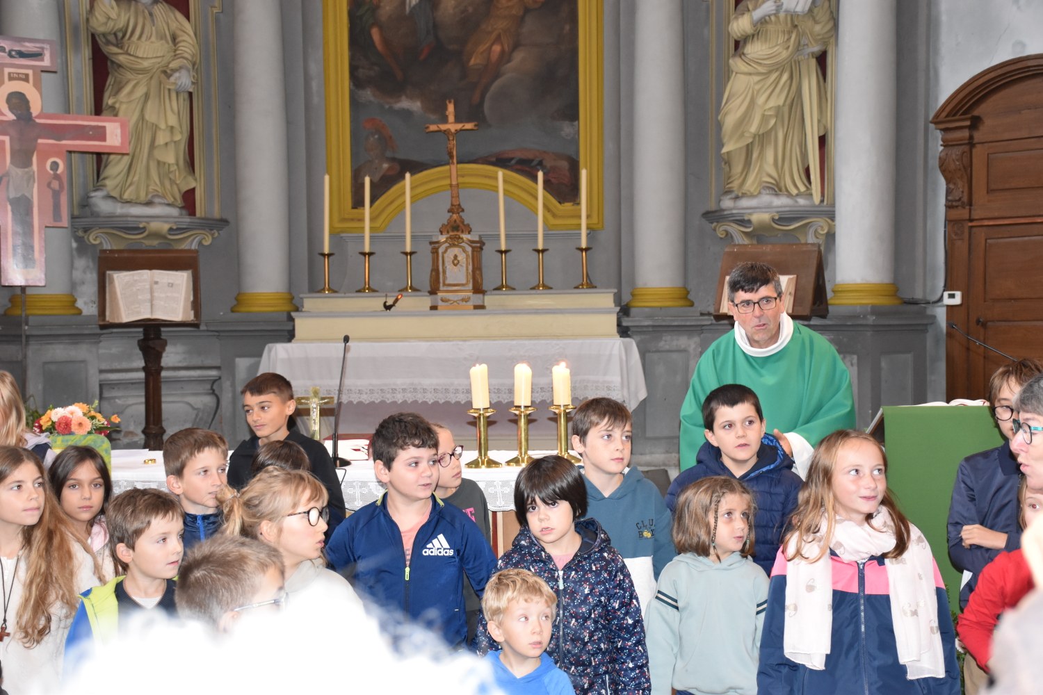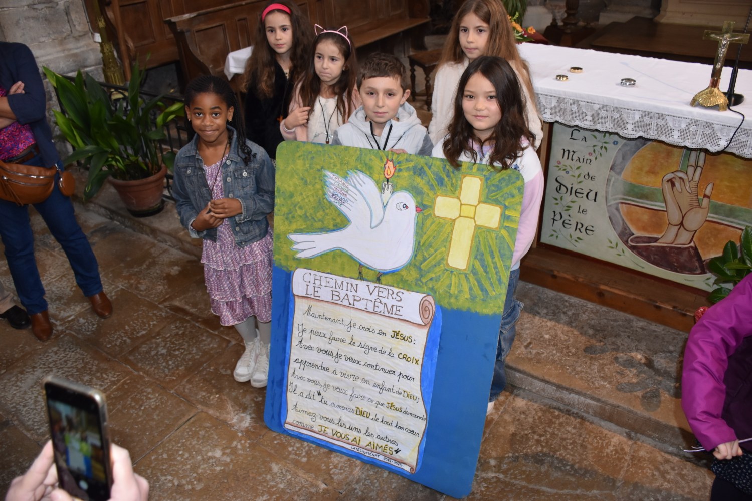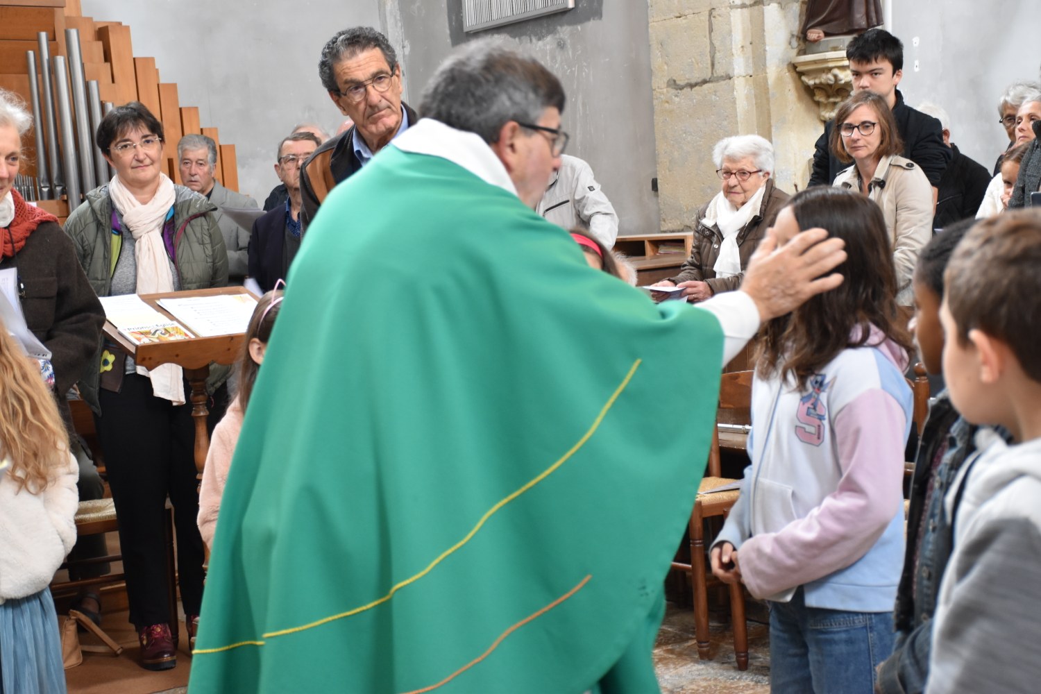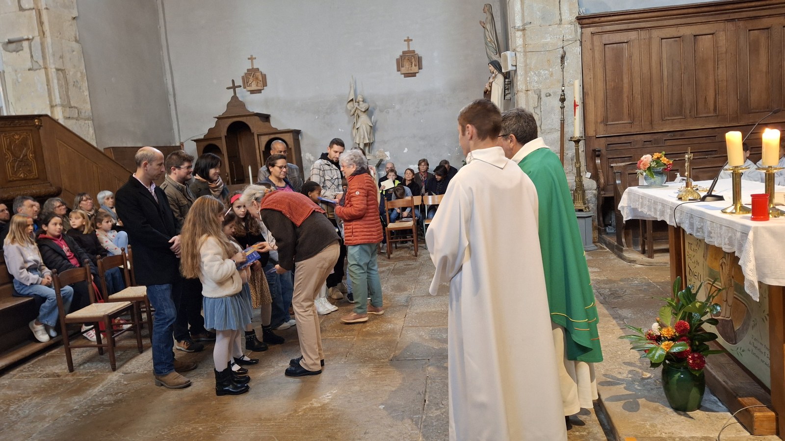 Dimanche 13 octobre 2024, à Marchaux durant la messe des familles : l’entrée en Église pour 6 enfants en âge scolaire.