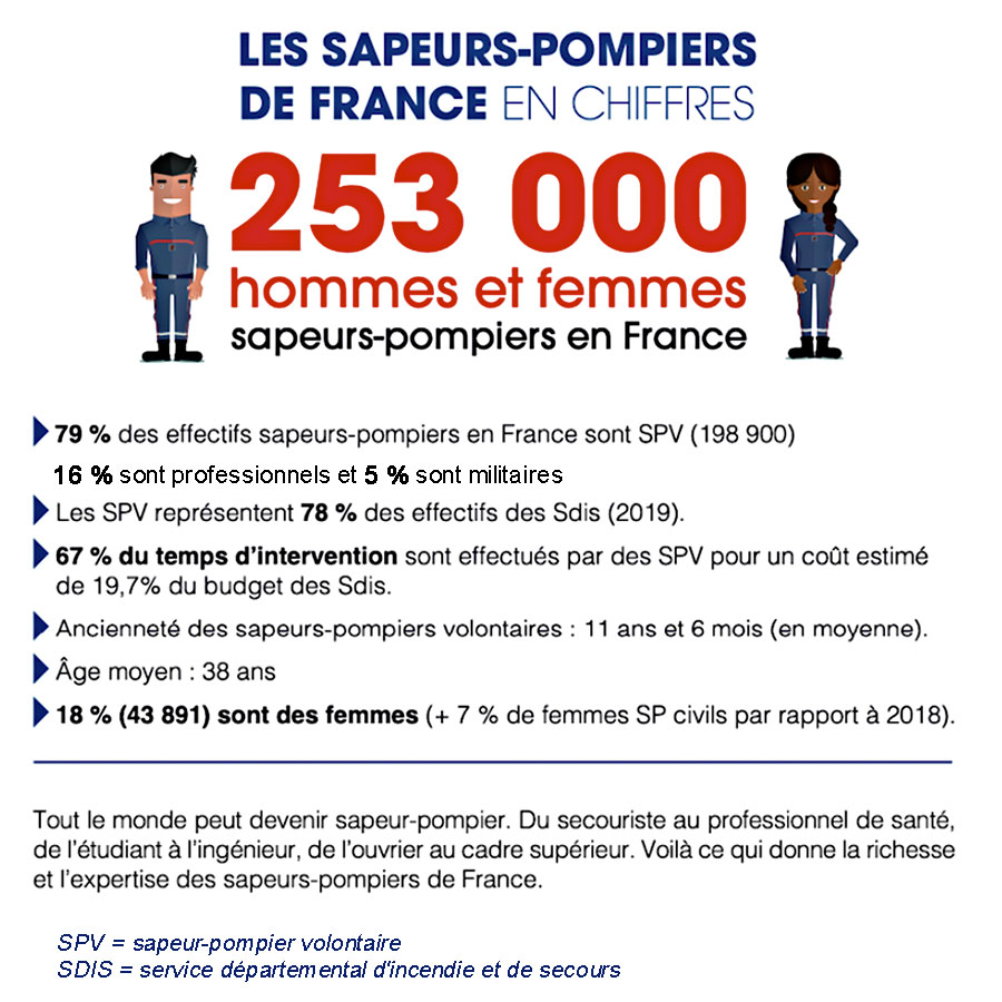 Le système de secours d’urgence français repose sur quelques 250 000 sapeurs-pompiers, femmes et hommes, présents en ville comme dans les campagnes les plus reculées, qui sont à près de 80 % des volontaires effectuant ces missions en plus de leur activité professionnelle : les sapeurs-pompiers volontaires (SPV).