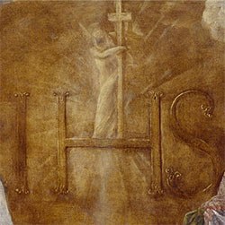 Rien d’étonnant, donc, que parmi ses disciples, un frère, St Bernardin de Sienne développe une forme de prière qui consiste à répéter le Nom de Jésus le plus souvent possible durant la journée. Il nous a laissé un sigle qui reprend Le nom de Jésus en grec : IHS (IH-SOUS, interprété en latin par Iesus Hominum Salvator), bien souvent repris sur les portes de nos tabernacles et sur nos croix. Saint Bernardin de Sienne favorise une véritable dévotion pour ce « Saint Nom de Jésus » dont il fait représenter les initiales sur un tableau qu’il montre lors de ses prédications. Les conversions se multiplient et la vénération se répand dans toute la péninsule italienne.