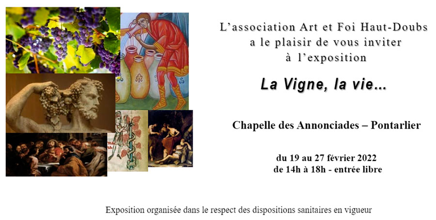 Depuis la plus haute antiquité la vigne a une grande place symbolique dans les religions. Les grandes civilisations l’ont associée à leurs dieux et le vin est un breuvage religieux depuis des millénaires. Le Christianisme a sacralisé le vin en en faisant le symbole du sang du Christ dont le partage constitue le sacrement d’union entre l’homme et Dieu ainsi que la communion entre les croyants. C’est ce qu’illustreront une dizaine d’artistes qui ont travaillé pour cette 9ème exposition d’Art et Foi.