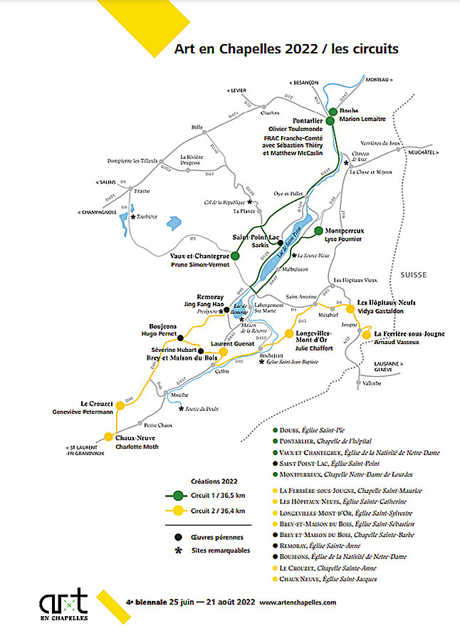 Depuis 9 ans, l'association Art en chapelles organise cette manifestation estivale d’envergure qui veut valoriser le patrimoine architectural régional en le faisant dialoguer avec le travail d’artistes contemporains. Cette biennale d'art contemporain invite une quinzaine d'artistes tous les 2 ans à exposer dans des chapelles ou églises sur le territoire du Haut-Doubs Forestier.