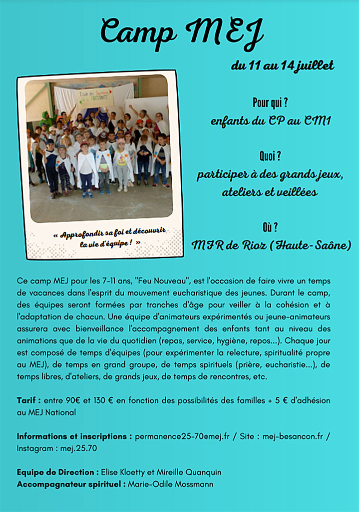Ce camp MEJ pour les 7-11 ans, "Feu Nouveau", est l'occasion de faire vivre un temps de vacances dans l'esprit du Mouvement Eucharistique des Jeunes.