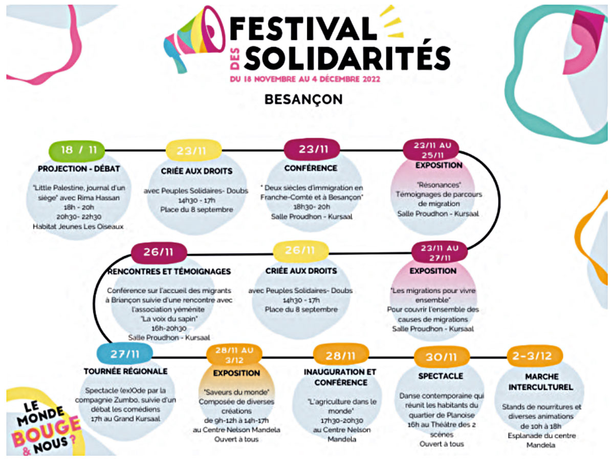 À Besançon, depuis 24 ans, chaque année en novembre, les structures membres du collectif Festisol organisent pendant trois semaines des événements conviviaux et engagés pour parler de solidarité, d’avenir, de climat et d'éducation, du local à l’international, à l’occasion de ce rendez-vous d’ampleur internationale qu’est le Festival des Solidarités. Cet ensemble d’événements sera l’occasion de faire connaître l’engagement de ces acteurs et actrices du territoire en faveur d’un monde plus juste, solidaire et durable, mais aussi de proposer à chacun et chacune d’agir concrètement pour transformer notre monde.