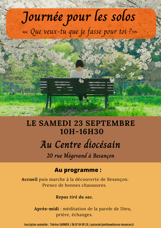 Journée pour les "Solos" Quand le 23/09/2023 de 10h00 à 16h30 Où Centre diocésain - 20 rue Mégevand - Besançon Contact Pastorale des familles Téléphone 06 07 84 09 19 Ajouter l'événement au calendrier vCal iCal