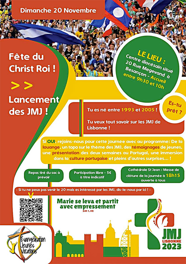 - 24/09/2022 à Pontarlier : Rencontre des jeunes 18-35 ans intéressés par les JMJ de 2023 à Lisbonne.