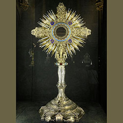 Lors de processions eucharistiques ou d’adorations, l’hostie consacrée est présentée aux fidèles dans un ostensoir. Par le soin guidant son choix et sa réalisation, cette pièce d’orfèvrerie est signe de l’importance apportée à la présence réelle du Christ, présence renouvelée de Dieu parmi les hommes.
