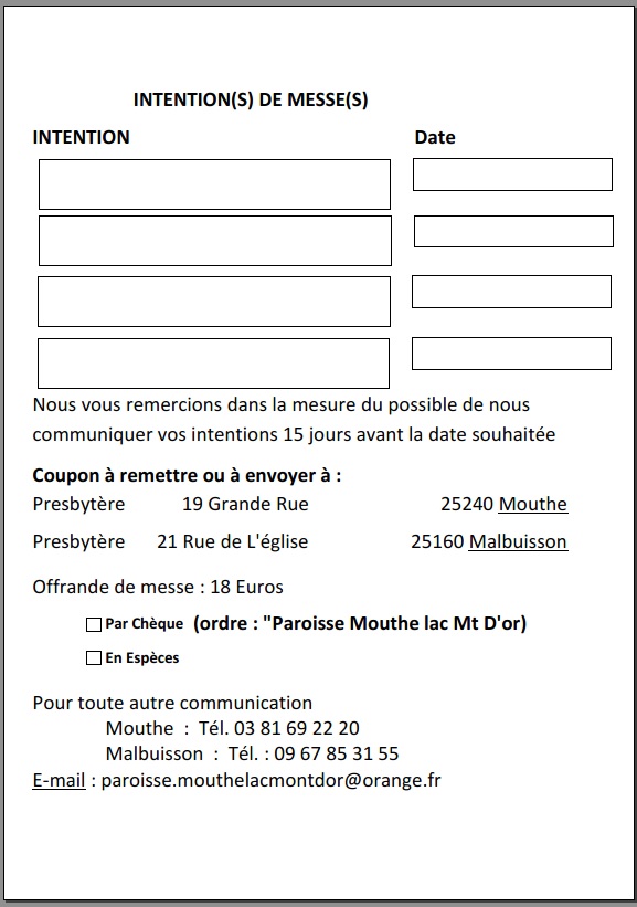 Si vous désirez donner une intention de messe, vous pouvez le faire à l'aide du formulaire à télécharger ci-dessous. Vous avez le choix de l'imprimer et de le remplir à la main, ou de le remplir depuis votre ordinateur, puis de l'imprimer.