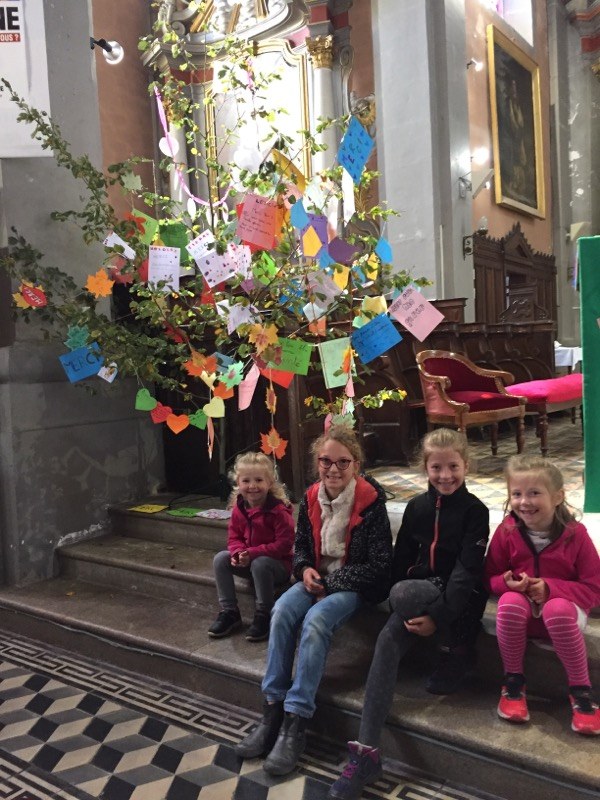 Pour la célébration de rentrée, les enfants ont réalisé une guirlande de MERCIS, disposée sur arbre
