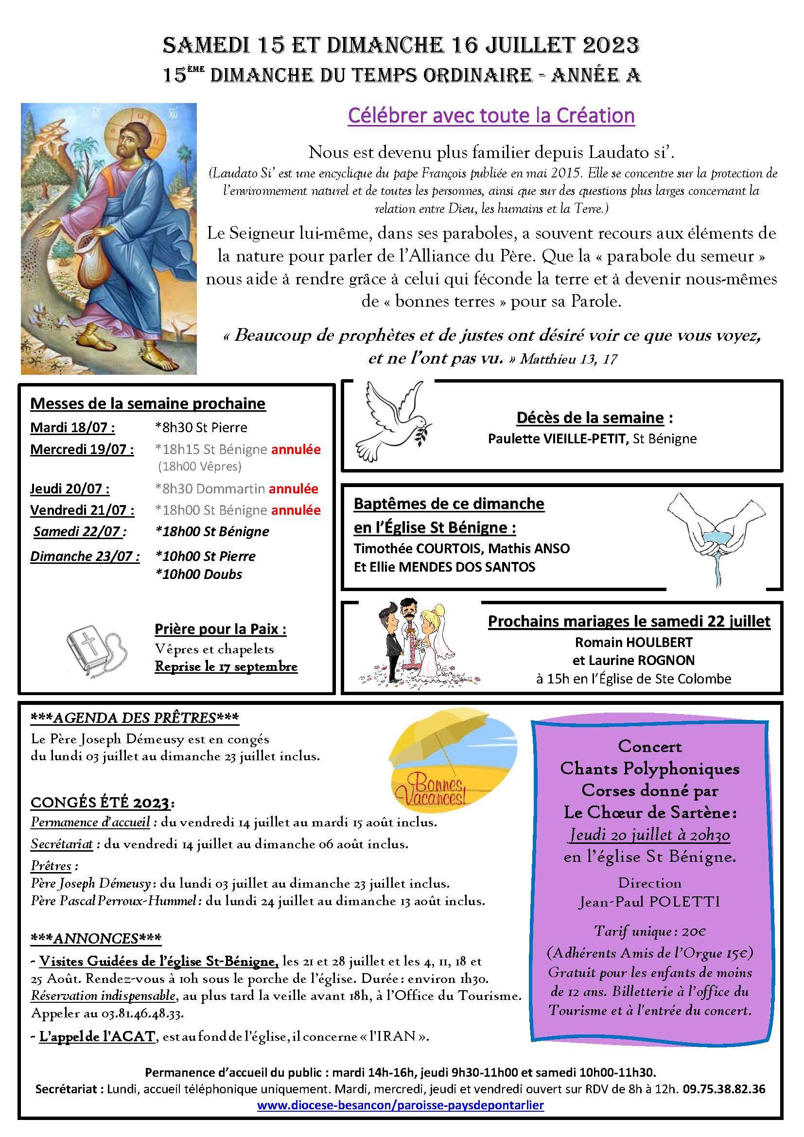 Annonces de la semaine du 16 juillet 2023 Publié le 14/07/2023 Erratum : la messe du mardi 4 juillet à 8h30 à l'église Saint Pierre est bien maintenue.