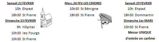 - Messe anticipée du dimanche : samedi 22 février à 18h30 à St Pierre