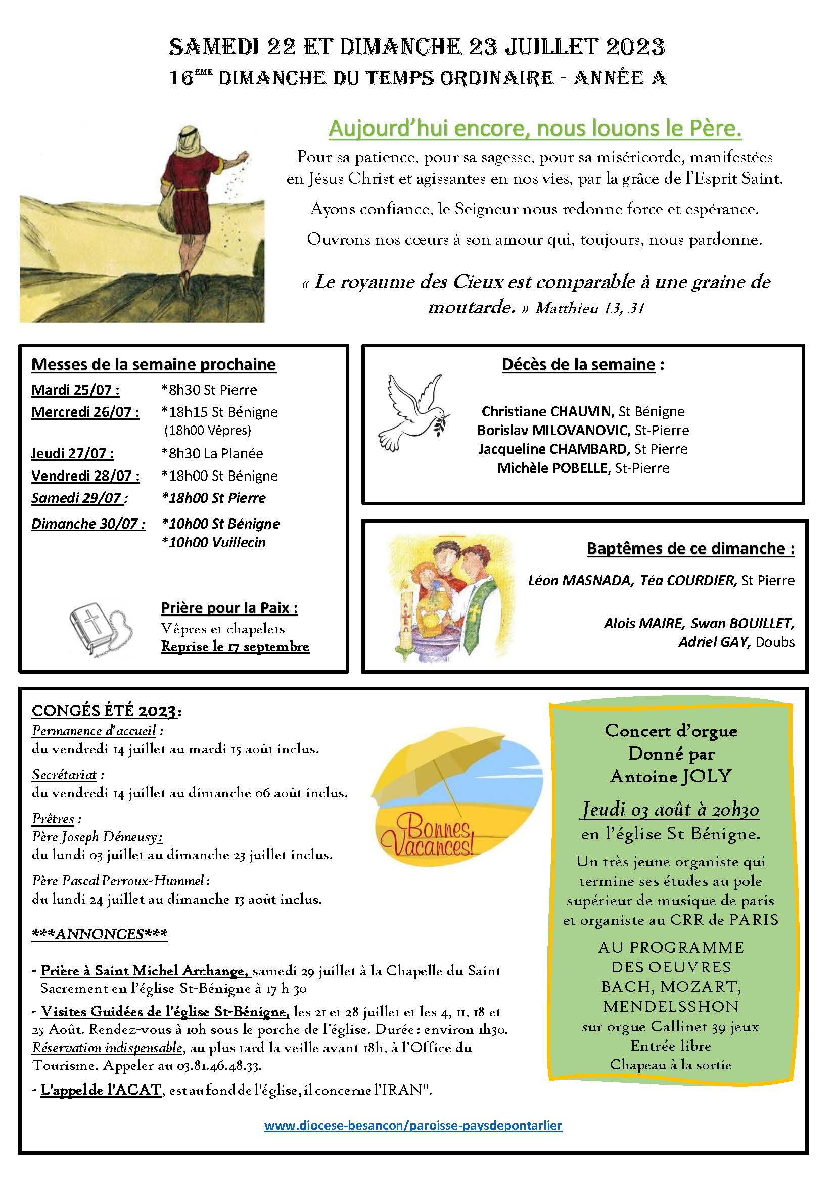 Annonces de la semaine du 23 juillet 2023 Publié le 21/07/2023 Erratum : la messe du mardi 4 juillet à 8h30 à l'église Saint Pierre est bien maintenue.