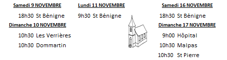- Messe anticipée du dimanche : samedi 9 novembre à 18h30 à St Bénigne