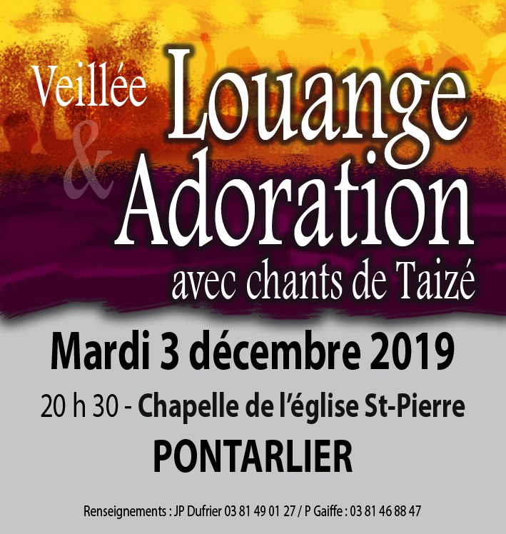 Veillée de Louange et Adoration avec les chants de Taizé Quand le 03/12/2019 de 20h30 à 21h30 Où Chapelle de l'Eglise St Pierre Contact JP Dufrier / P Gaiffe Téléphone 03 81 49 01 27 / 03 81 46 88 47 Ajouter l'événement au calendrier vCal iCal