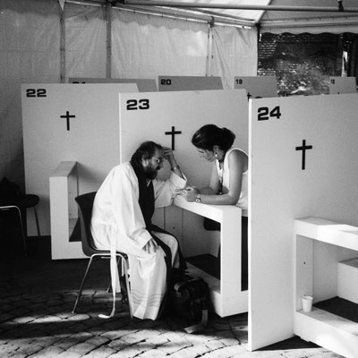 Illustration : Confession célébration pénitentielle prêtre et femme pardon scène des JMJ Rome - Date de création 13/11/2000