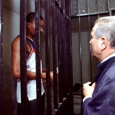 Illustration : FLEURIS-MEROGIS : VISITE DE L' AUMONIER CATHOLIQUE A LA MAISON D'ARRET DES HOMMES: AIME JACQUET, AUMONIER LAIC, RENCONTRE CHAQUE LUNDI LES PRISONNEIRS QUI EN ONT FAIT LA DEMANDE, DANS LEUR CELLULE. ATTENTION: LES VISAGES DES DETENUS DOIVENT ETRE OBLIGATOIREMENT MASQUES. Date de création : 02/10/2000