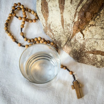 10 janvier 2020 : Illustration du Carême. Verre d'eau, pain et chapelet. France.