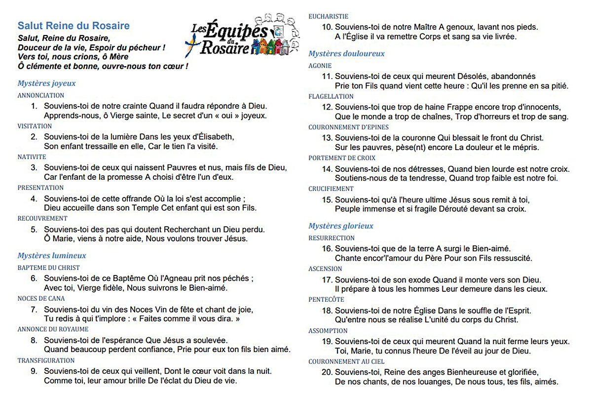 * chaque mois : pour la prière ensemble “à la maison”, chez l’un ou l’autre des membres de l’équipe, pour méditer la Parole de Dieu en s’appuyant sur le feuillet mensuel “Le Rosaire en Équipe”.
