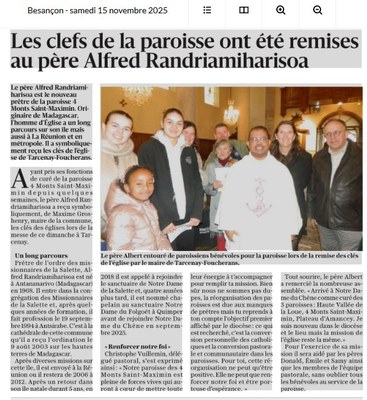 Le père Albert RANDRIAMIHARISOA, né en 1968, est nommé curé des 3 paroisses : Haute Vallée de la Loue, Plateau d'Amancey et Quatre Monts Saint Maximin. Il arrive du diocèse de Quimper.