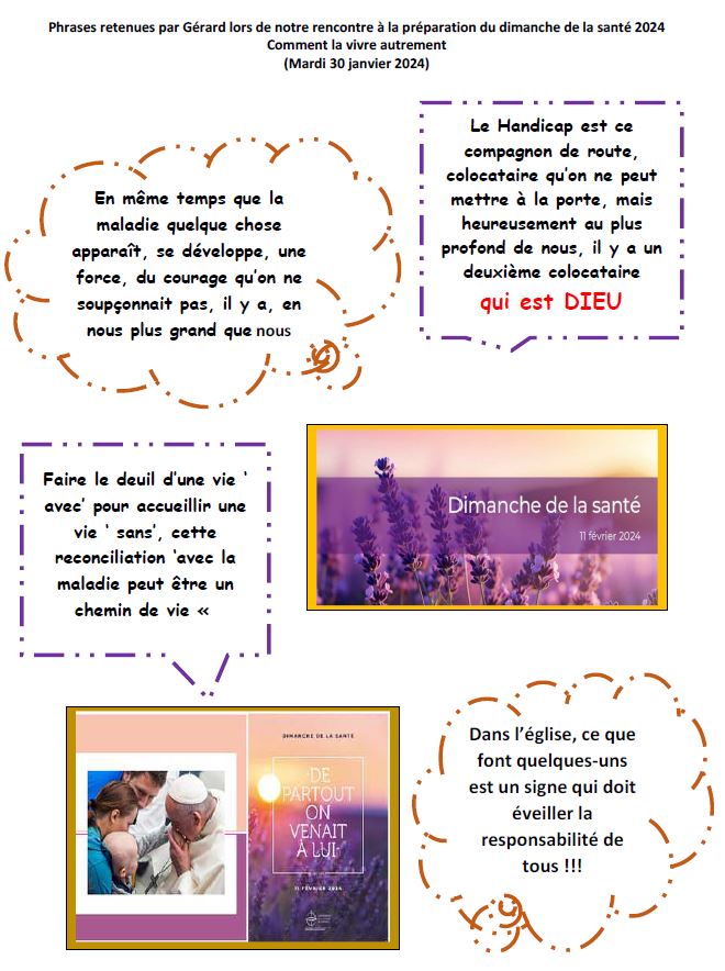 La vocation du dimanche de la santé est vraiment de rendre visible dans les communautés chrétiennes, l'ensemble des soignants, des chercheurs, des malades, les équipes d'aumoneries et toutes les associations,,, ceux qui oeuvrent souvent dans l'ombre et sont tellement essentiels pour la prise en charge des personnes malades, agées, handicapées.