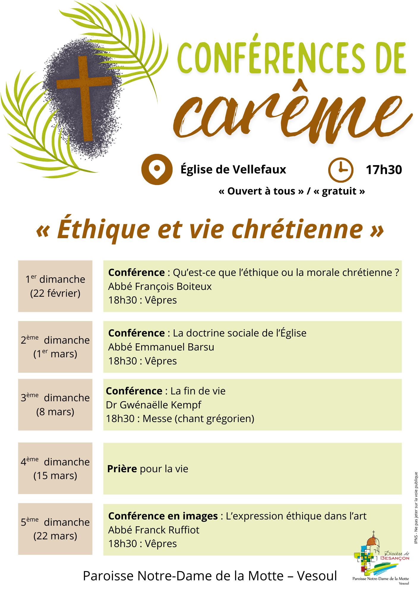 « Éthique et vie chrétienne ». Ce sera le thème des 5 conférences qui vous sont proposées durant les cinq dimanches de Carême.