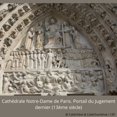 Le retour du Christ à la fin des temps (la Parousie) est associé à la résurrection des morts et au Jugement dernier. Les représentations du Jugement dernier au cours des siècles ont marqué notre imaginaire mais ces représentations risquent de nous éloigner du sens biblique du jugement. L’iconographie a donné beaucoup de place au côté menaçant de ce jugement. Comme on le voit sur le portail du Jugement dernier de la Cathédrale Notre -Dame de Paris, les morts ressuscitent et sortent de leur tombe ; l’archange Michel pèse les âmes ; les élus sont conduits au paradis (à la droite du Christ) tandis que les damnés, enchainés et terrifiés, sont menés par d’autres démons vers l’enfer ; au tympan, le Christ en majesté est assis en gloire.