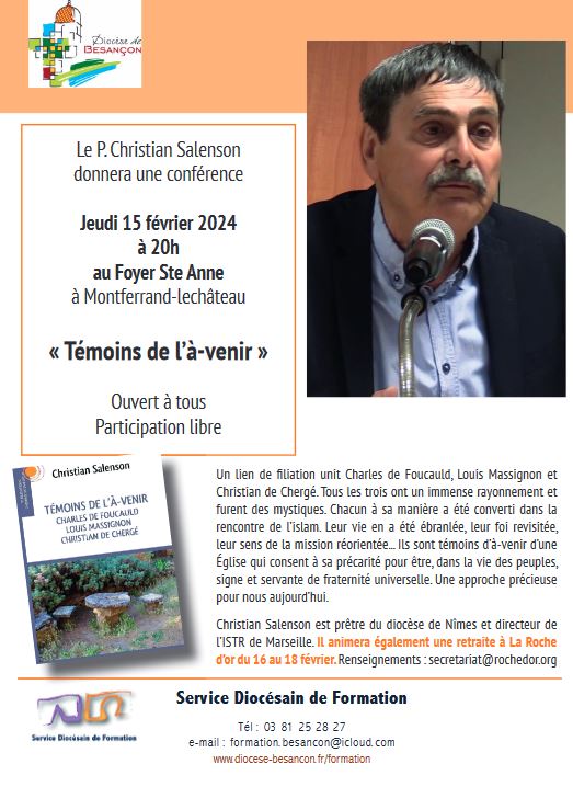 Le P. Christian Salenson donnera une conférence au Foyer Ste Anne à Montferrand-le-Château, le jeudi 15 février à 20h.