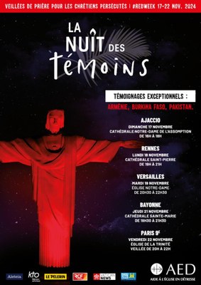 Depuis 14 ans, l’AED organise des veillées de prières dans différentes villes du monde pour honorer tous les martyrs et les chrétiens qui, aujourd’hui, ne peuvent pas vivre librement leur foi. Cette année, la Nuit des Témoins aura lieu à Ajaccio, Rennes, Versailles, Bayonne et Paris.