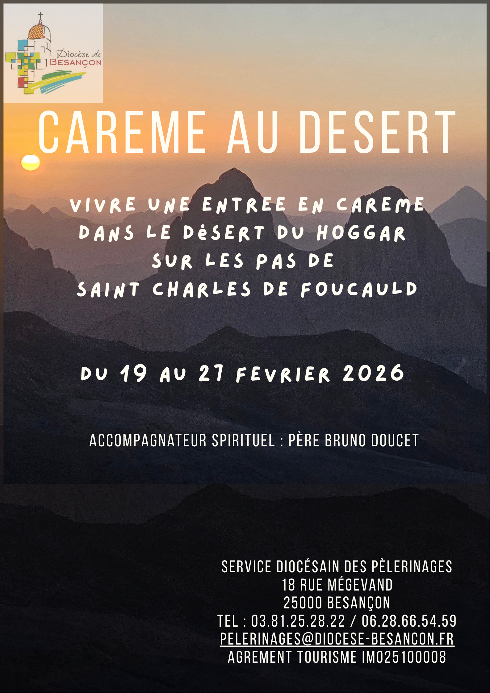 Invités à vivre les premiers jours du carême au désert à la suite du Christ, ce cantique que nous chantons au débute du carême dit bien ce que nous vous proposons pendant 8 jours du 19 au 27 février 2026 : un temps au cœur du désert le plus vaste du monde avec des frères et des sœurs catholiques et musulmans qui nous accueilleront et des frères et des sœurs pèlerins avec lesquels nous cheminerons.